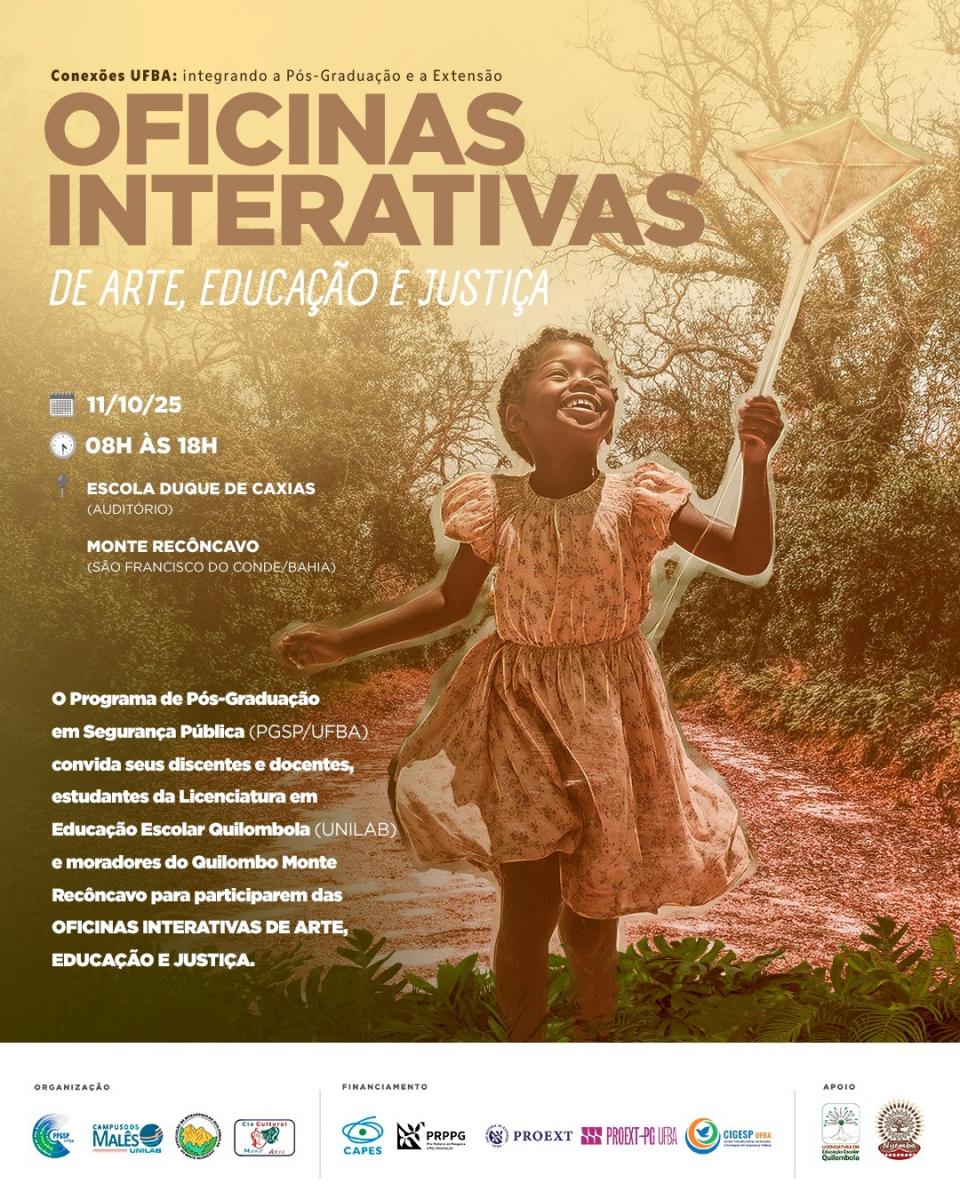 Nessa ação, docentes do Mestrado em Segurança Pública, Justiça e Cidadania e discentes, da turma do Ministério Público do Estado da Bahia, estarão conduzindo um conjunto de atividades que irão abordar o racismo ambiental. Esse projeto é resultado de uma chamada (EDITAL CONJUNTO PROEXT-PG 01/2024) conjunta entre a nossa Pró-Reitoria de Extensão (PROEXT) e a Pró-Reitoria de Pós-Graduação (PRPPG). Destaca-se também que nesse evento, teremos a parceria da UNILAB, o que possibilitará a participação dos estudantes de Licenciatura em Educação Escolar Quilombola. O evento acontecerá no Quilombo Monte Recôncavo (São Francisco do Conde) - Auditório da Escola Duque de Caxias.